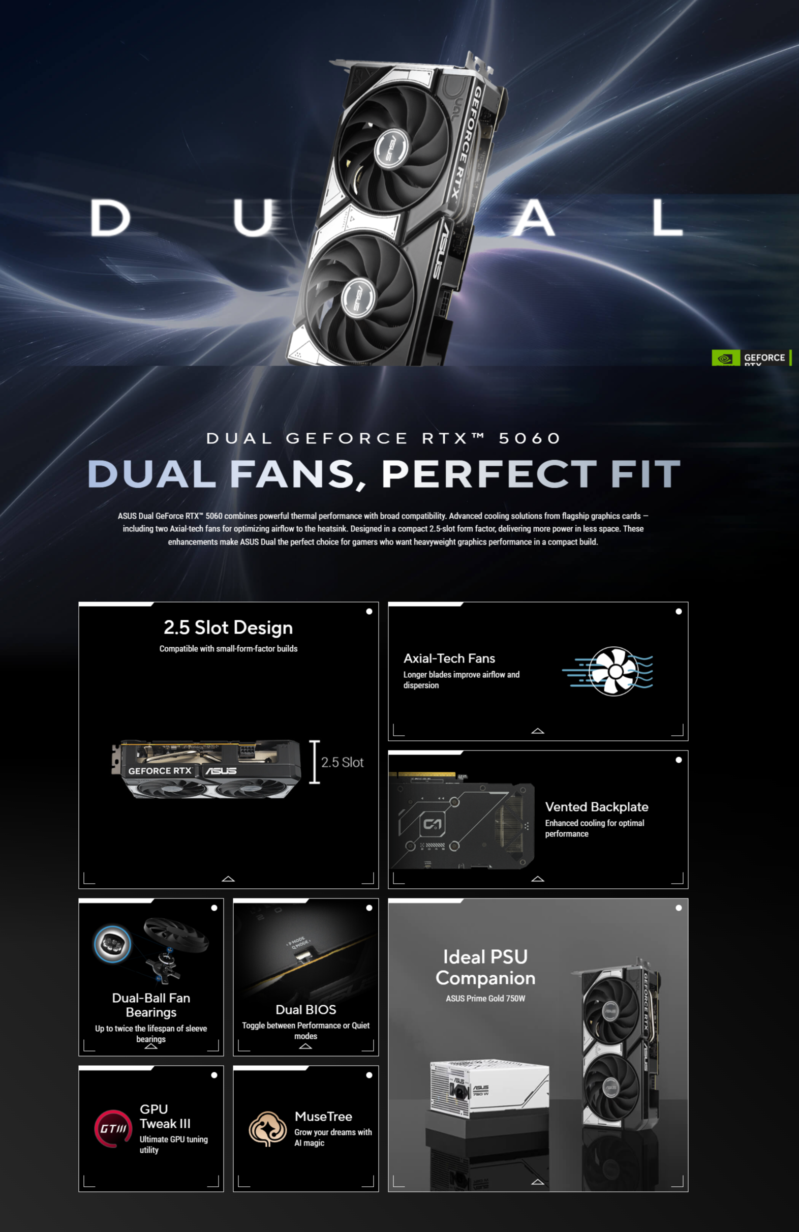 ASUS Dual GeForce RTX™ 5060 combines powerful thermal performance with broad compatibility. Advanced cooling solutions from flagship graphics cards — including two Axial-tech fans for optimizing airflow to the heatsink. Designed in a compact 2.5-slot form factor, delivering more power in less space.