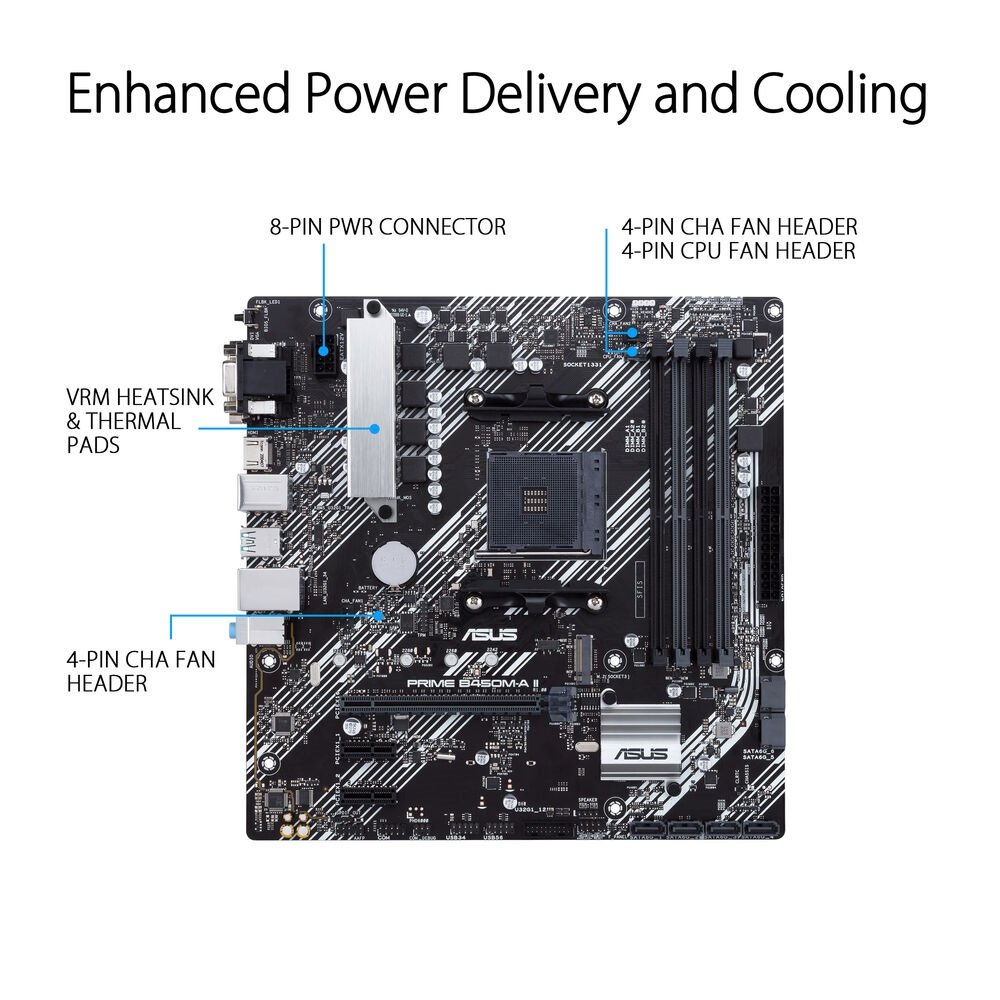 ASUS Prime B450M II Series motherboards provide the solid foundation needed for your first build, plus flexibility to grow with your ambitions. We’ve melded all the good stuff that’s packed into AMD Ryzen™ processors with essential ASUS design and engineering, so you benefit from industry-leading technologies — including automated system tuning, comprehensive cooling controls, and immersive onboard audio. When you build with an ASUS Prime B450M II Series motherboard, you build smart, easy and affordably.