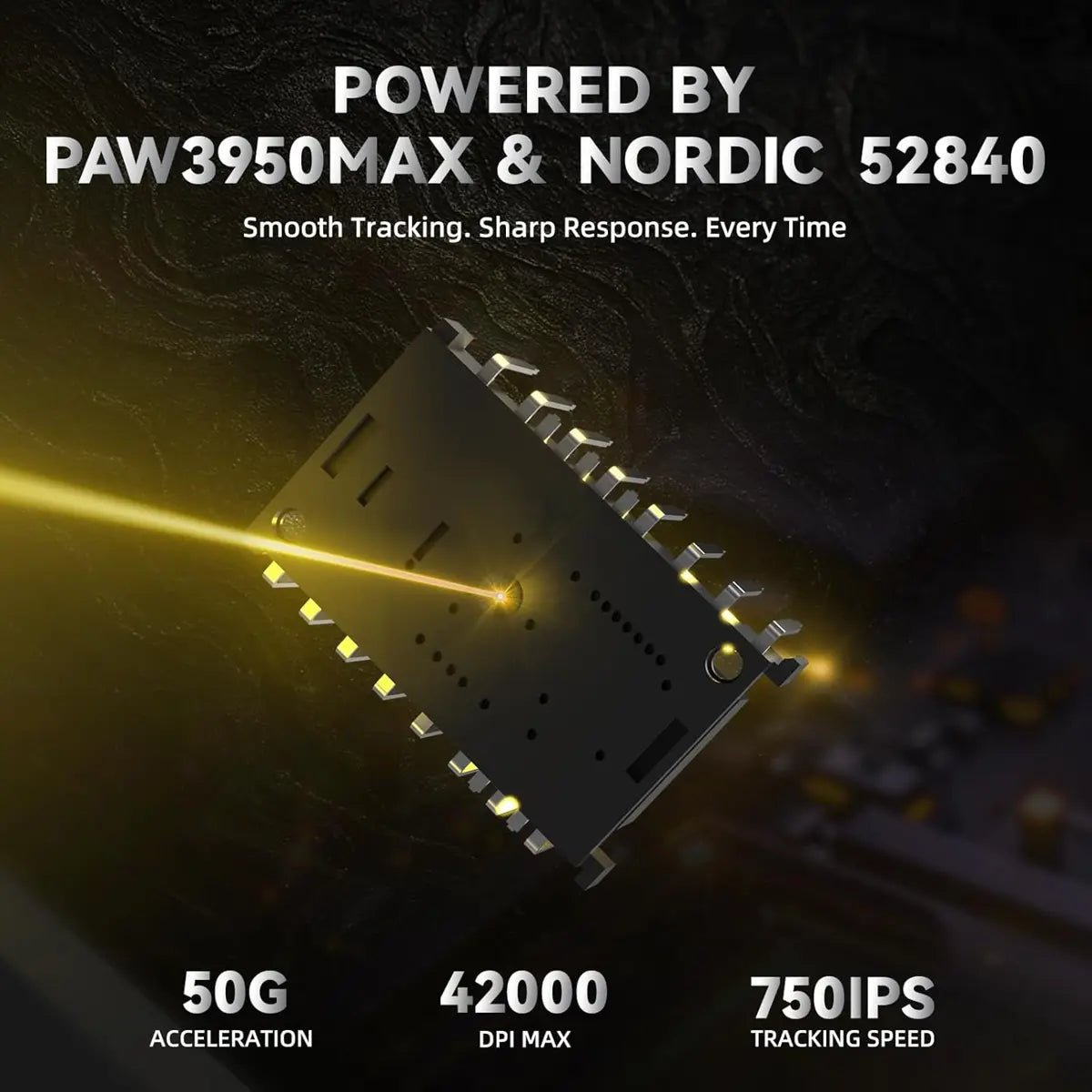 Crush every limit with the PAW3950MAX sensor—42,000 DPI for pinpoint precision, 750 IPS for unstoppable speed, and 50G acceleration to keep up with your every move. Driven by the Nordic 52840 MCU, it delivers lightning-fast response and flawless wireless stability. Built for victory, built for you.