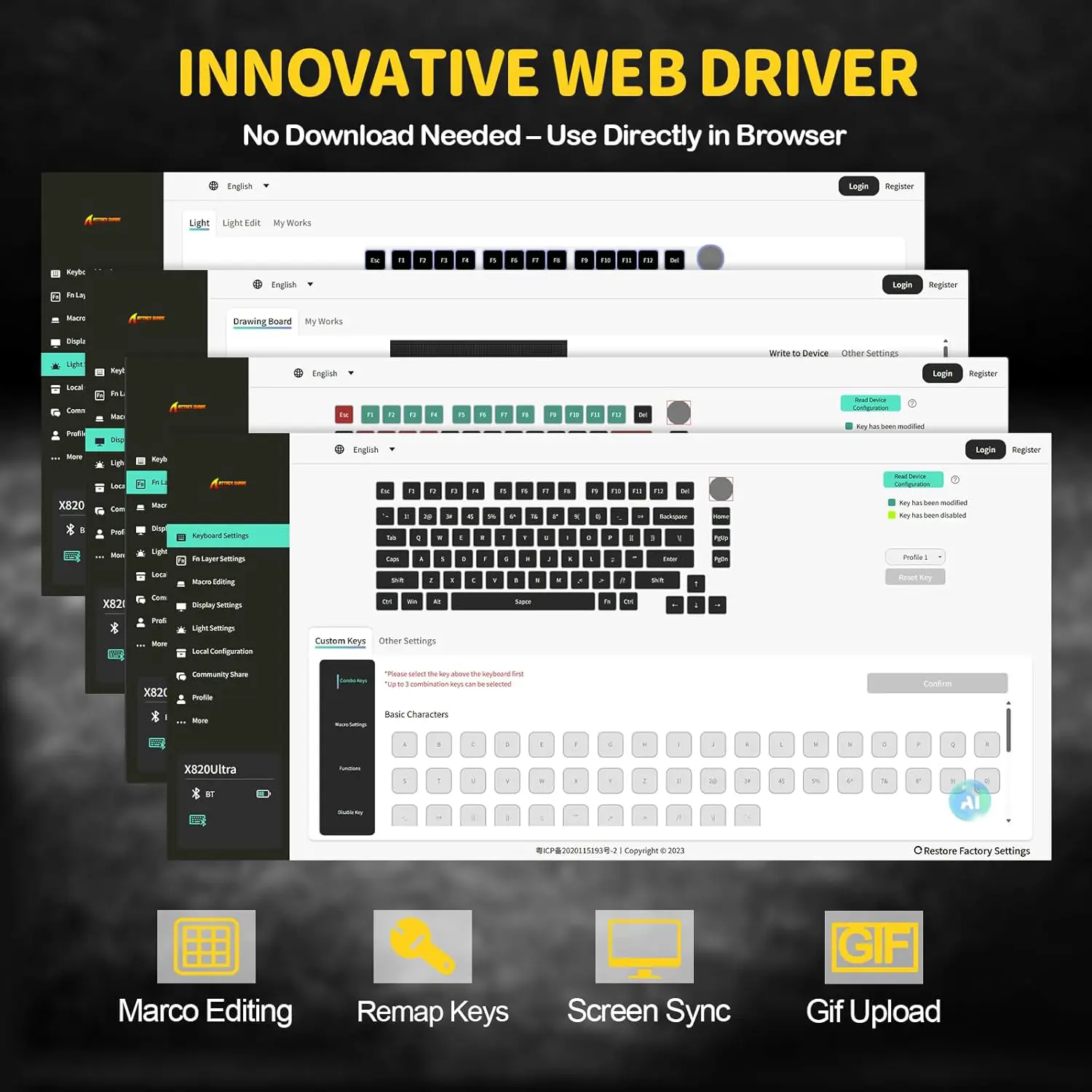 The ATTACK SHARK X820 Ultra Wireless mechanical keyboard features a smart TFT color display that shows time, battery level, connection status, and RGB backlight effects. Easily customize GIF animations via the driver. The precision CNC metal knob lets you scroll menus and press to adjust lighting brightness, speed, and system settings—making your keyboard intuitive and fun to use.