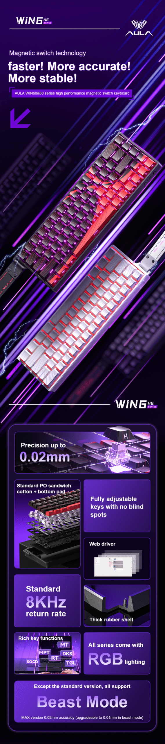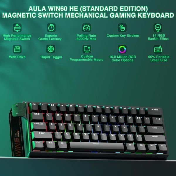 The black Aula Win60 he magnetic keyboard is designed for users who demand speed, precision, and a compact layout without sacrificing performance. Crafted with a sleek 60% form factor, it fits seamlessly into any workspace while offering the advanced features that gamers, creators, and everyday users need. With cutting-edge magnetic switch technology, every keystroke feels responsive, smooth, and consistent, delivering exceptional accuracy whether you’re typing, editing, or gaming.