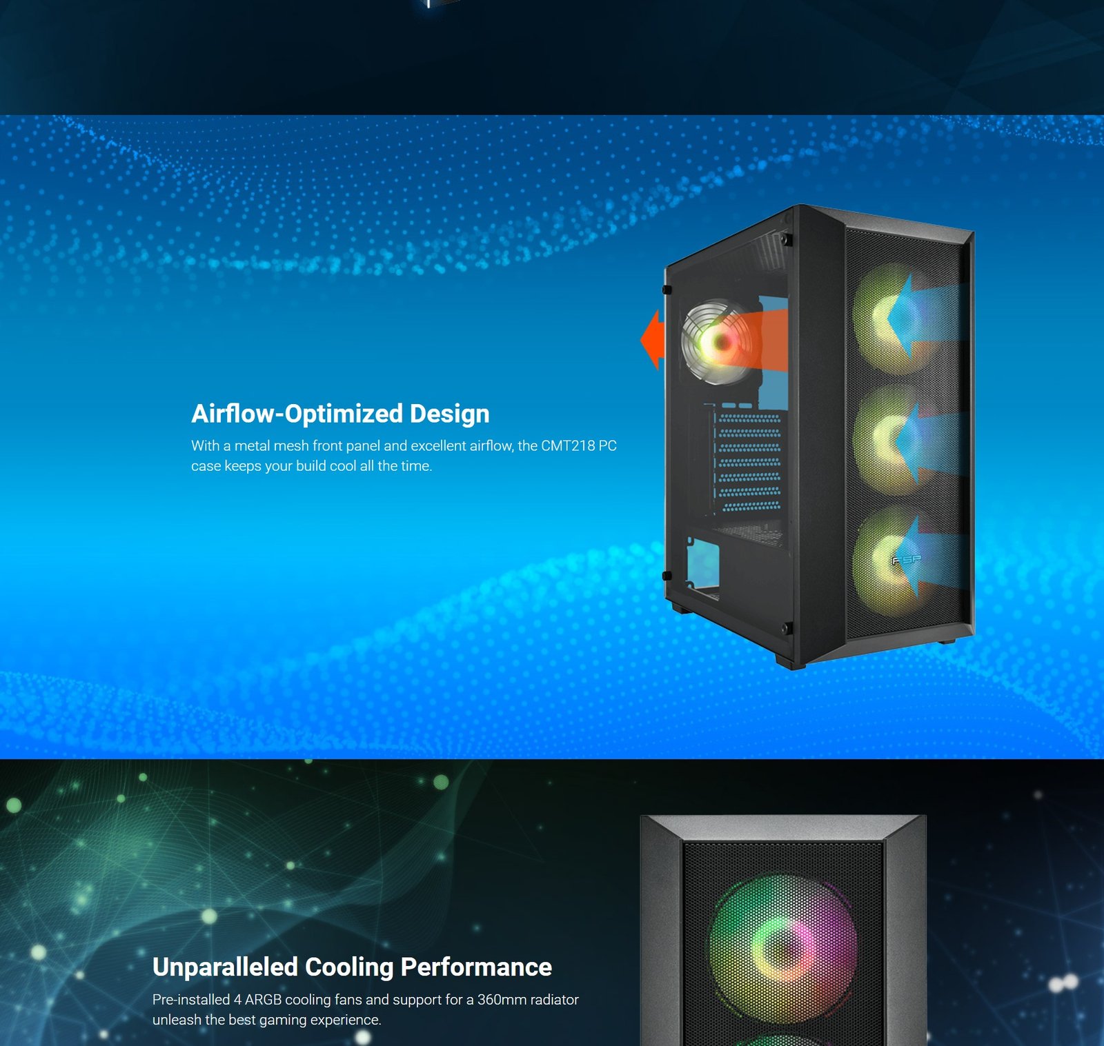 With a metal mesh front panel and excellent airflow, the CMT218 PC case keeps your build cool all the time.
