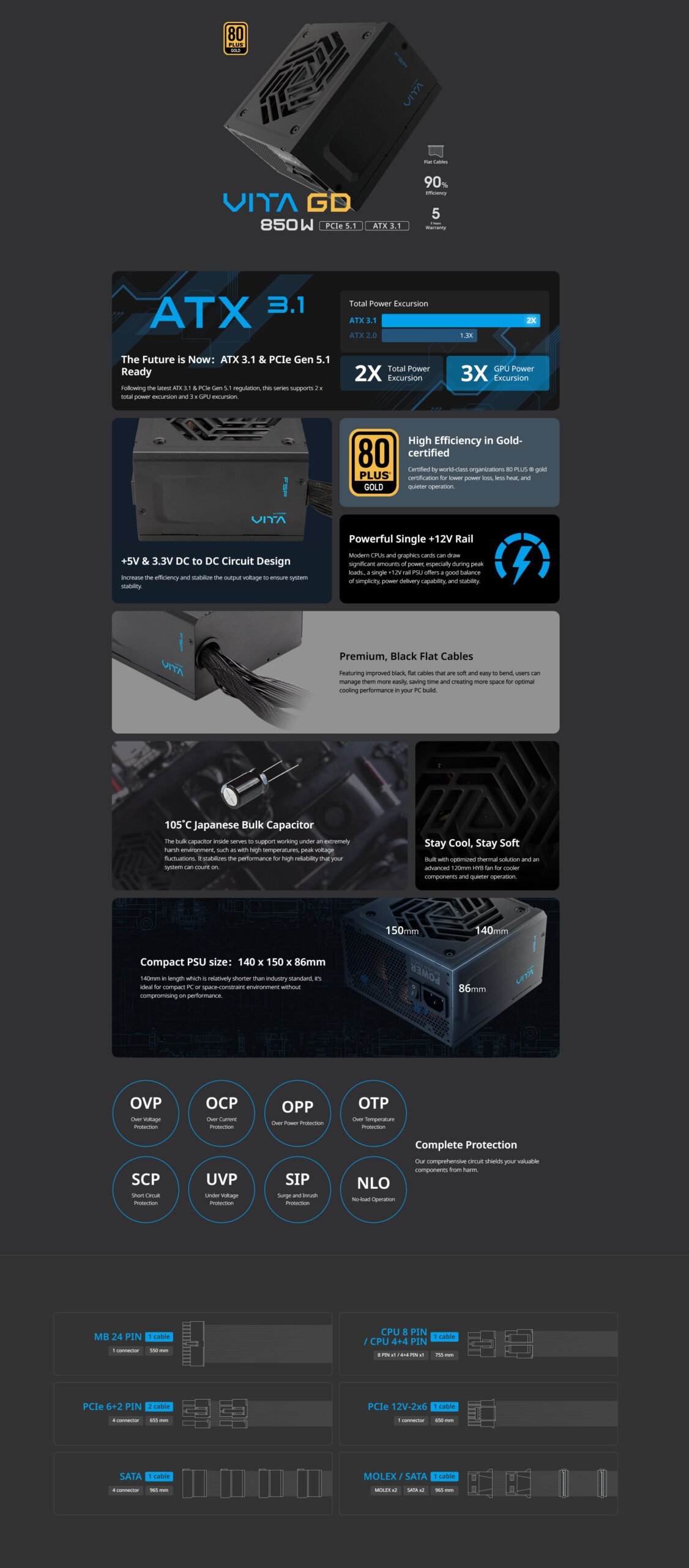 FSP Vita GD 850W 80 Plus Gold ATX 3.1 PCIe 5.1 Power Supply: