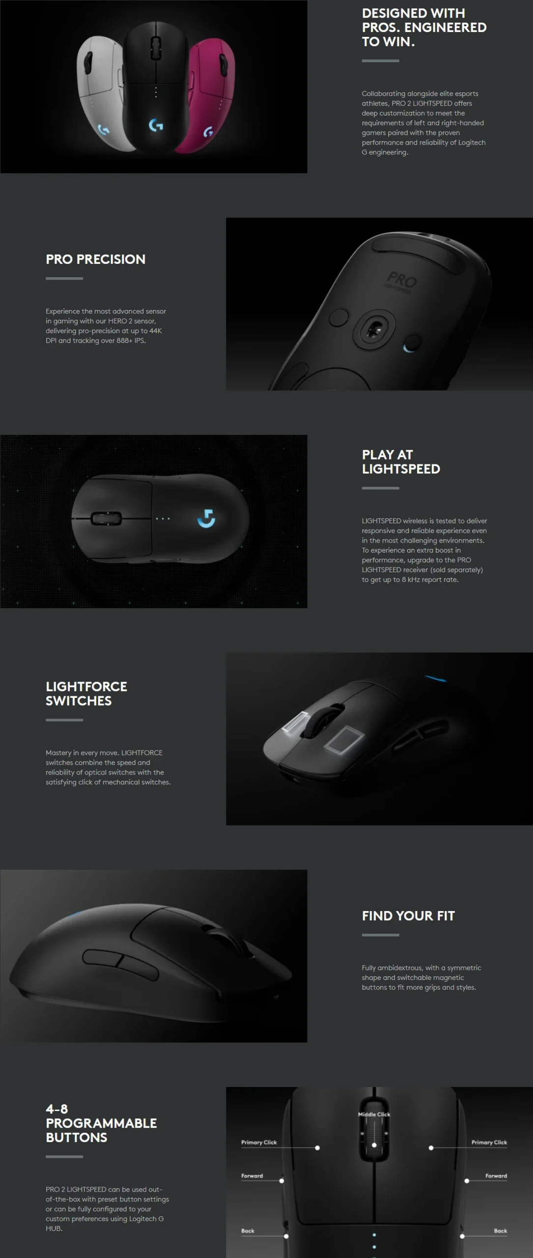 Collaborating alongside elite esports athletes, PRO 2 LIGHTSPEED offers deep customization to meet the requirements of left and right-handed gamers paired with the proven performance and reliability of Logitech G engineering.
