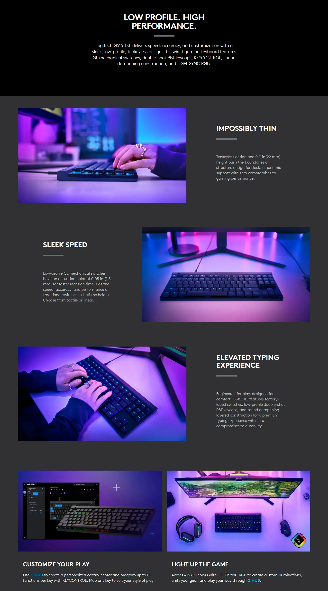Logitech G515 TKL delivers speed, accuracy, and customization with a sleek, low-profile, tenkeyless design. This wired gaming keyboard features GL mechanical switches, double-shot PBT keycaps, KEYCONTROL, sound dampening construction, and LIGHTSYNC RGB.