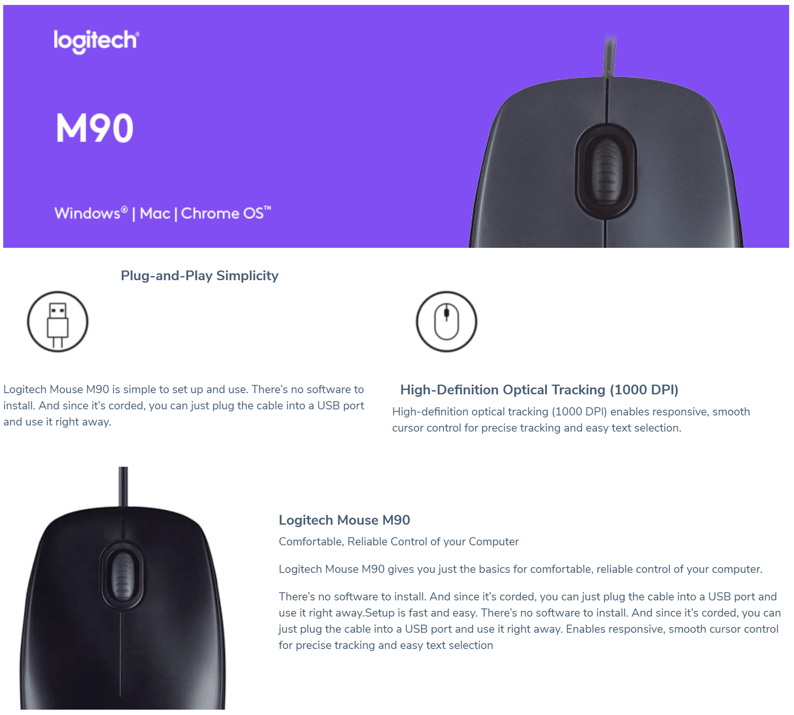 Logitech Mouse M90 is simple to set up and use. There’s no software to install. And since it’s corded, you can just plug the cable into a USB port and use it right away.