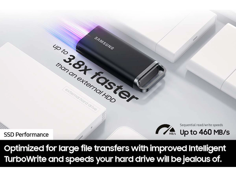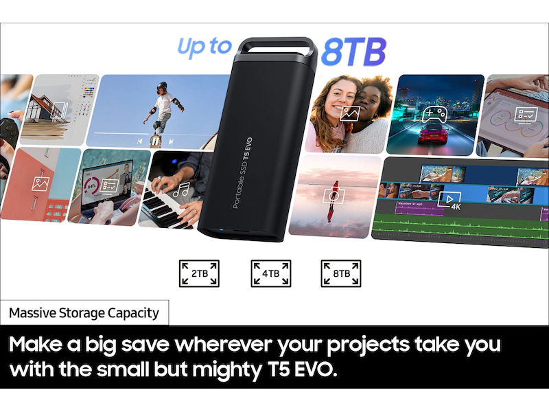 T5 EVO—an ideal choice for gamers and content creators. This SSD is engineered to handle large file transfers while still small and nimble enough to take on the go.