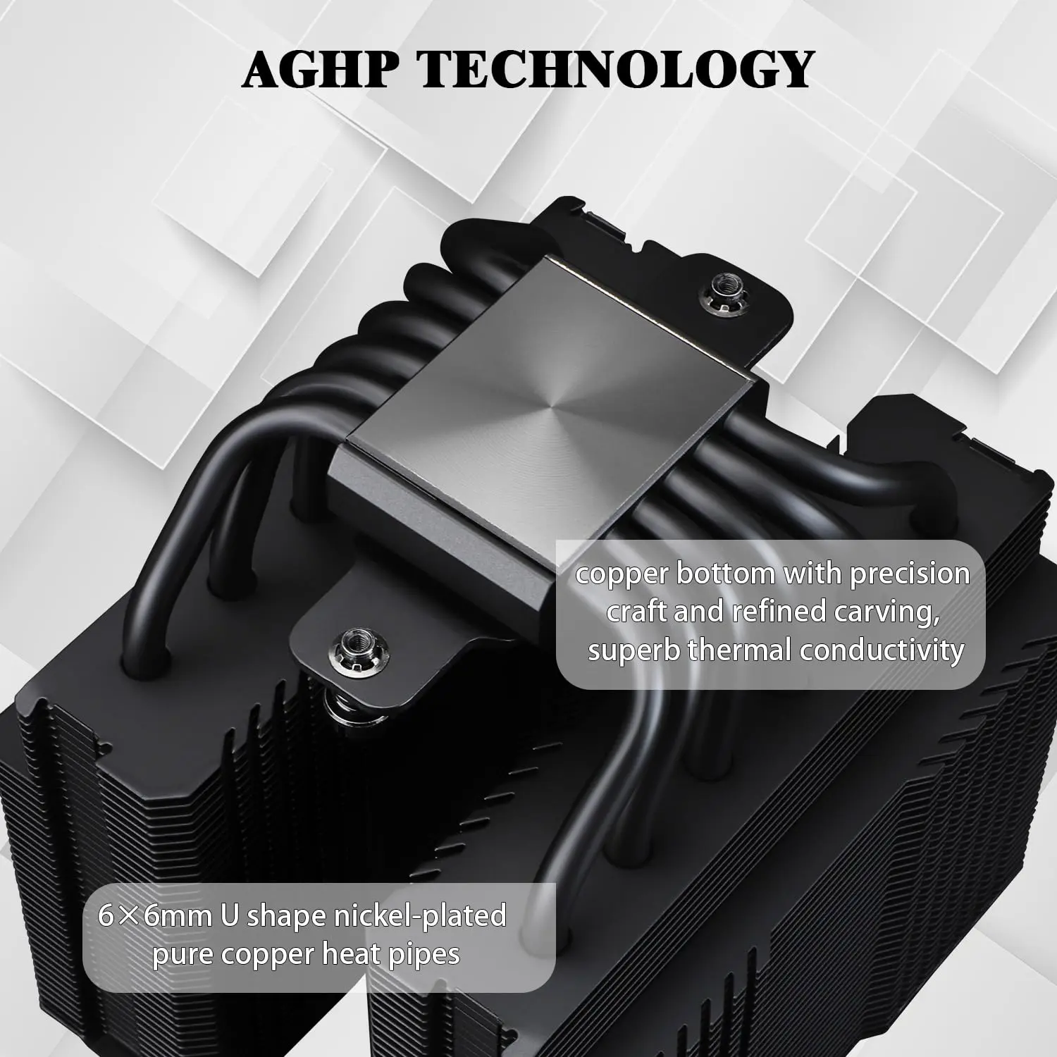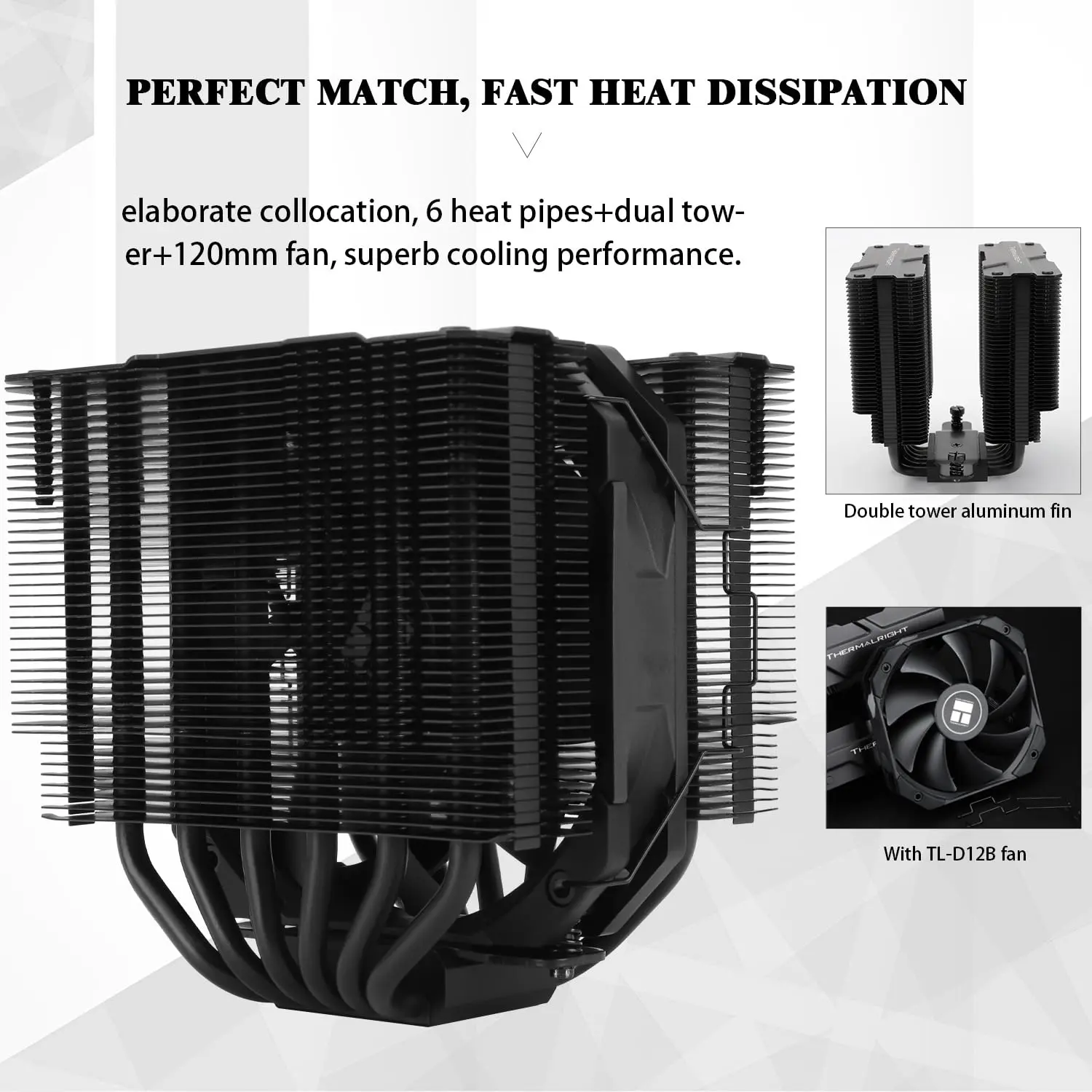 CPU cooler’s strong heat dissipation is created by 6 heatpipes + dual tower + performance fan, dual tower structure for 48 pieces of all-aluminium fins * 2, to a certain extent, increase the cooling area, by the pure copper base to heat transfer to the 6 heatpipes.