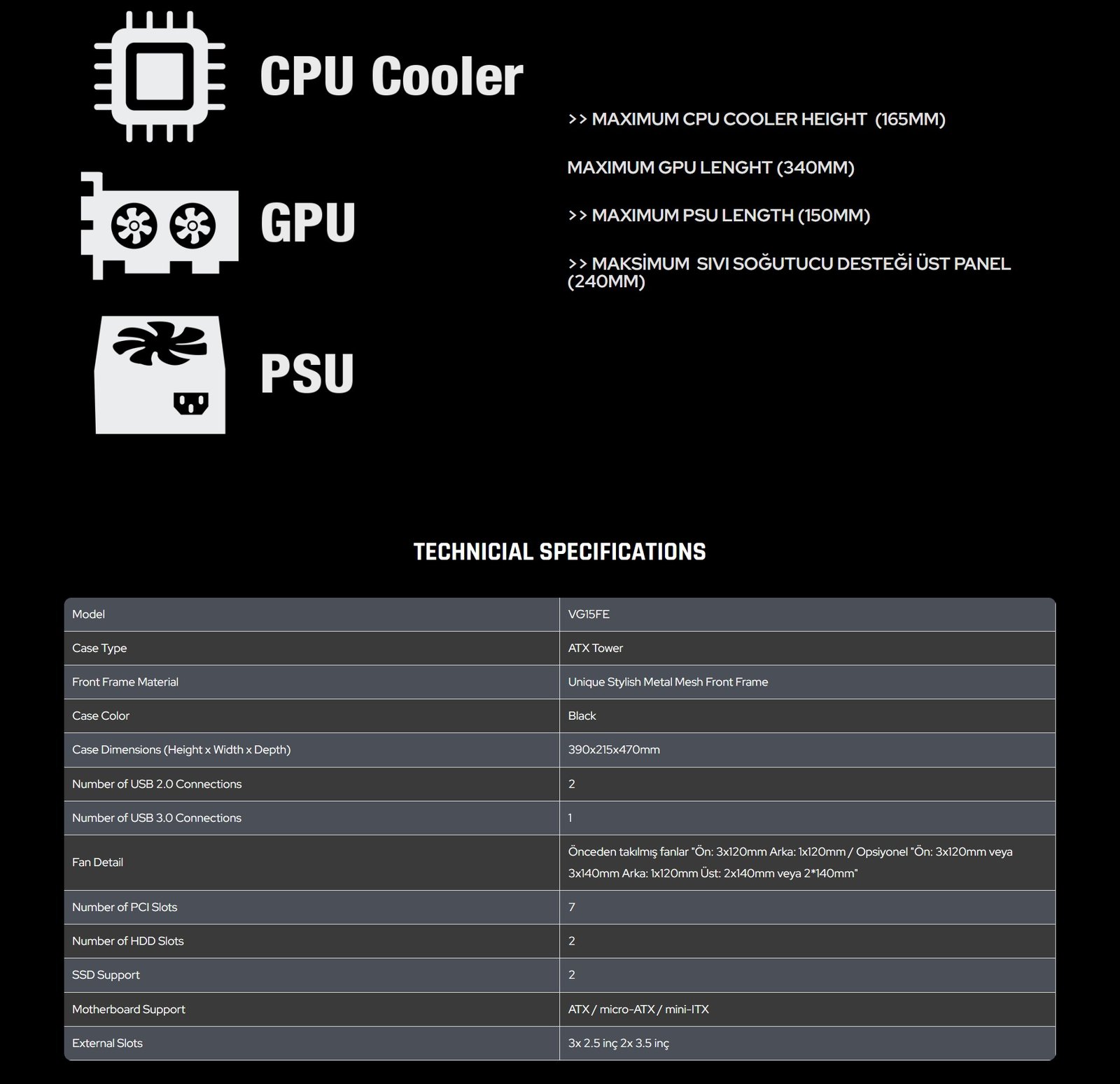 | Fan Detail | Önceden takılmış fanlar “Ön: 3x120mm Arka: 1x120mm / Opsiyonel “Ön: 3x120mm veya 3x140mm Arka: 1x120mm Üst: 2x140mm veya 2*140mm” |