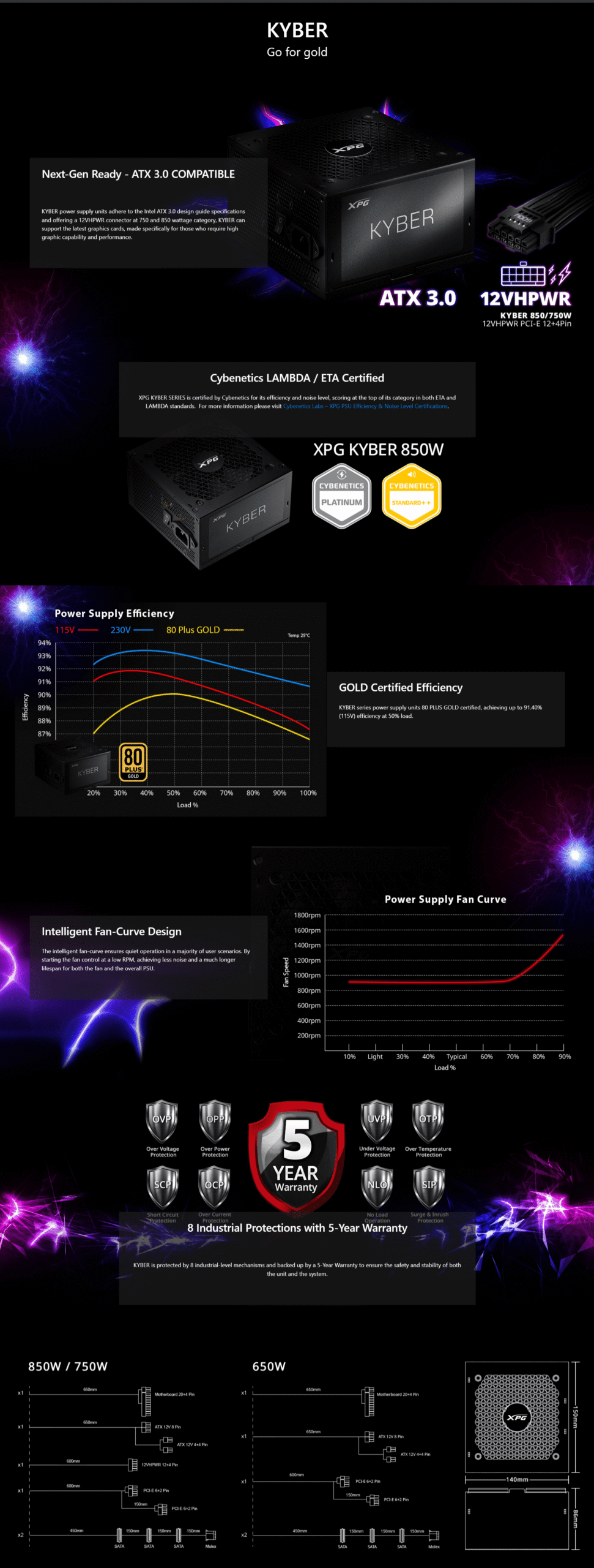 XPG KYBER offers GOLD efficiency and adhere to the Intel ATX 3.0 design guide specifications and offering a 12VHPWR connector at 750 and 850 wattage category, KYBER can support the latest graphics cards, made specifically for those who require high graphic capability and performance.